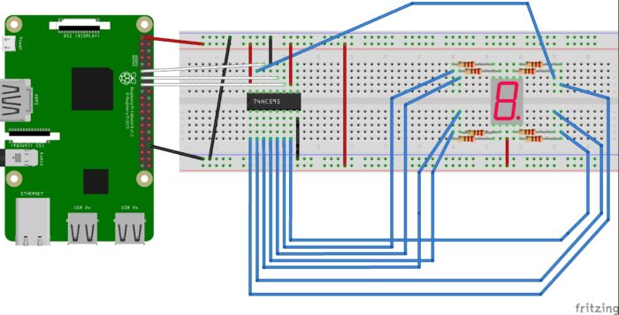 # 74HC595(シフトレジスタ)のそれぞれのピンをRaspberryPiのGPIOと接続する。