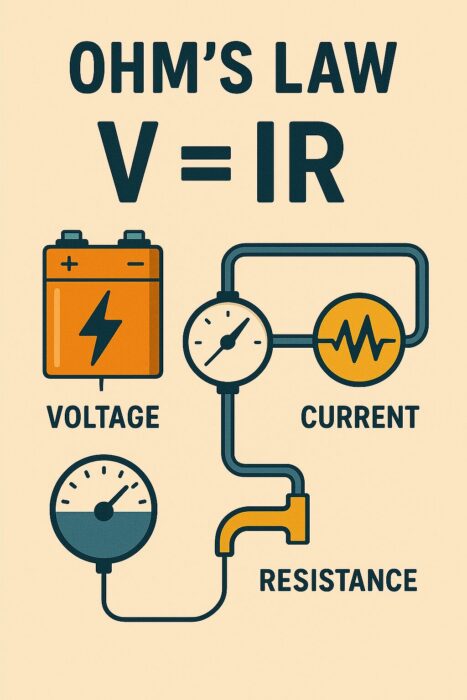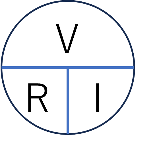- I(電流)を隠す → 残るのは V が R の上 → だから、I=V/R