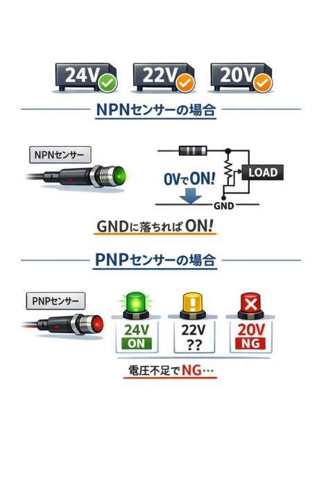 NPN出力の場合、うれしいことがあります。それが、ON/OFFの基準となるのが、GNDに落ちたらONというところです。つまり、電源が22Vだろうと20Vだろうと、GNDと同じに落ちたらONになります。一方PNP出力の場合は、24VでONになる想定ですから、20VではONにならない。ということも最悪あり得るわけです。