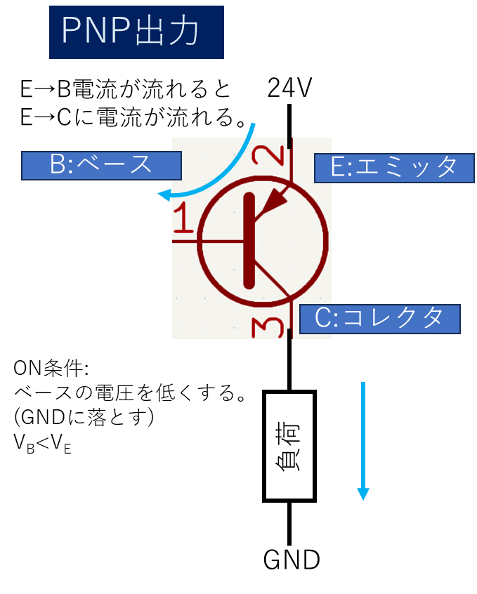 - PNP 出力:+24V→エミッタ→コレクタ→外部機器→GND