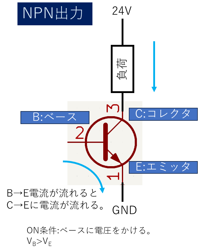 NPN 出力は「GND を出す側」です。制御される側から、制御側に24Vが流れます。出口を作ってあげるイメージです。